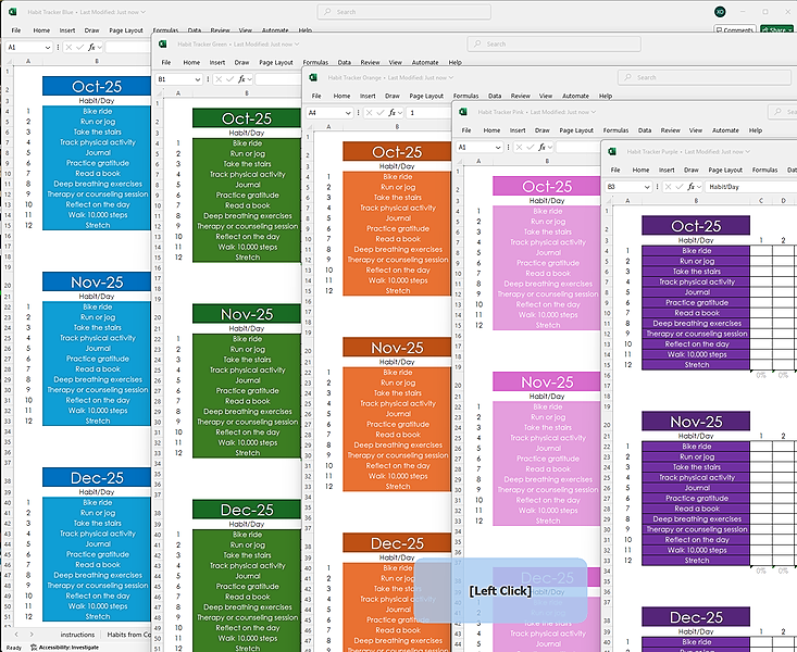 BundleHabit Trackers, as seen in my YouTube video! In this bundle you will receive one in every color shown: Blue, Green, Orange, Pink and Purple